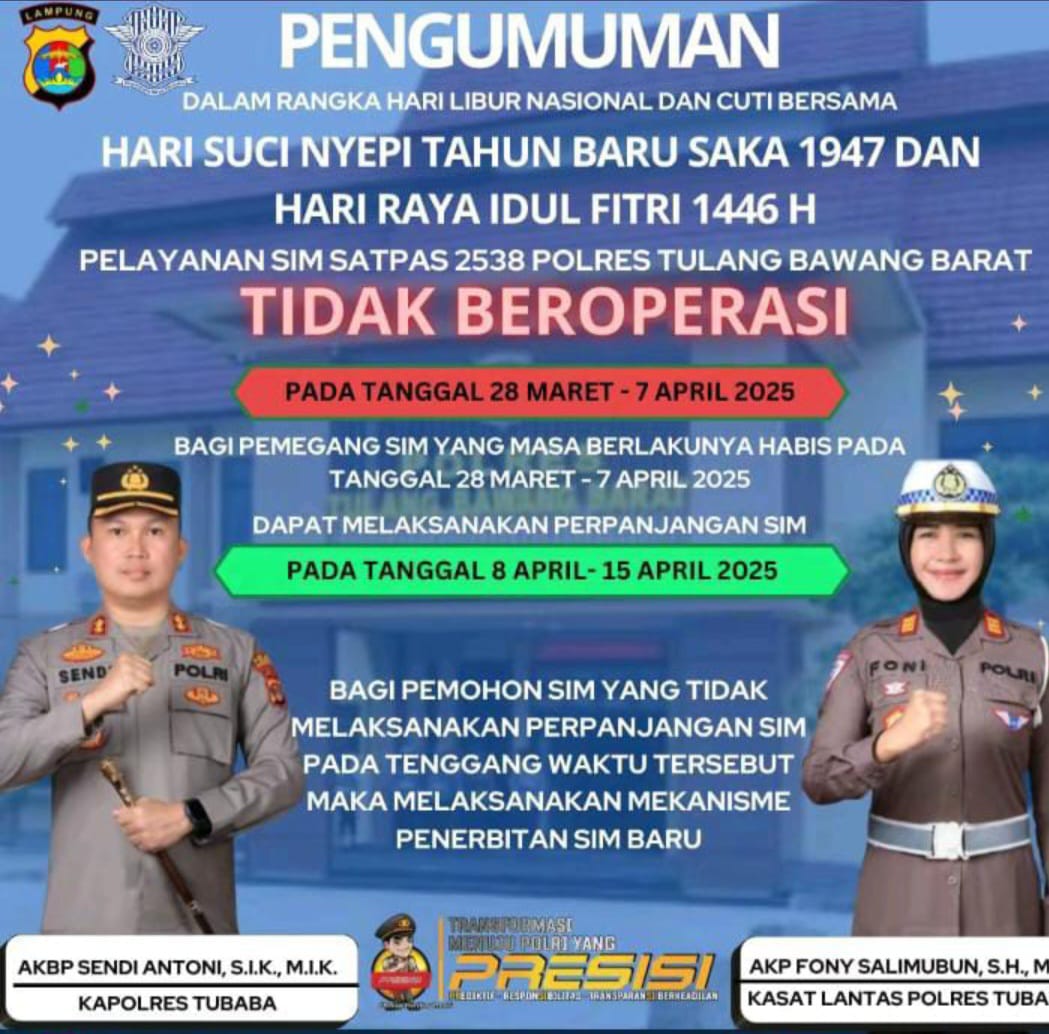 GerbangAndalas.com, Tulang Bawang Barat- Dalam rangka menyambut libur dan cuti bersama Hari Raya Nyepi Tahun Baru Saka 1947 serta Idul Fitri 1446 H, pelayanan publik di Polres Tubaba mengalami penyesuaian. Mulai tanggal 28 Maret hingga 7 April 2025, pelayanan penerbitan Surat Izin Mengemudi (SIM) serta layanan perpajakan di Samsat akan diliburkan untuk sementara waktu.