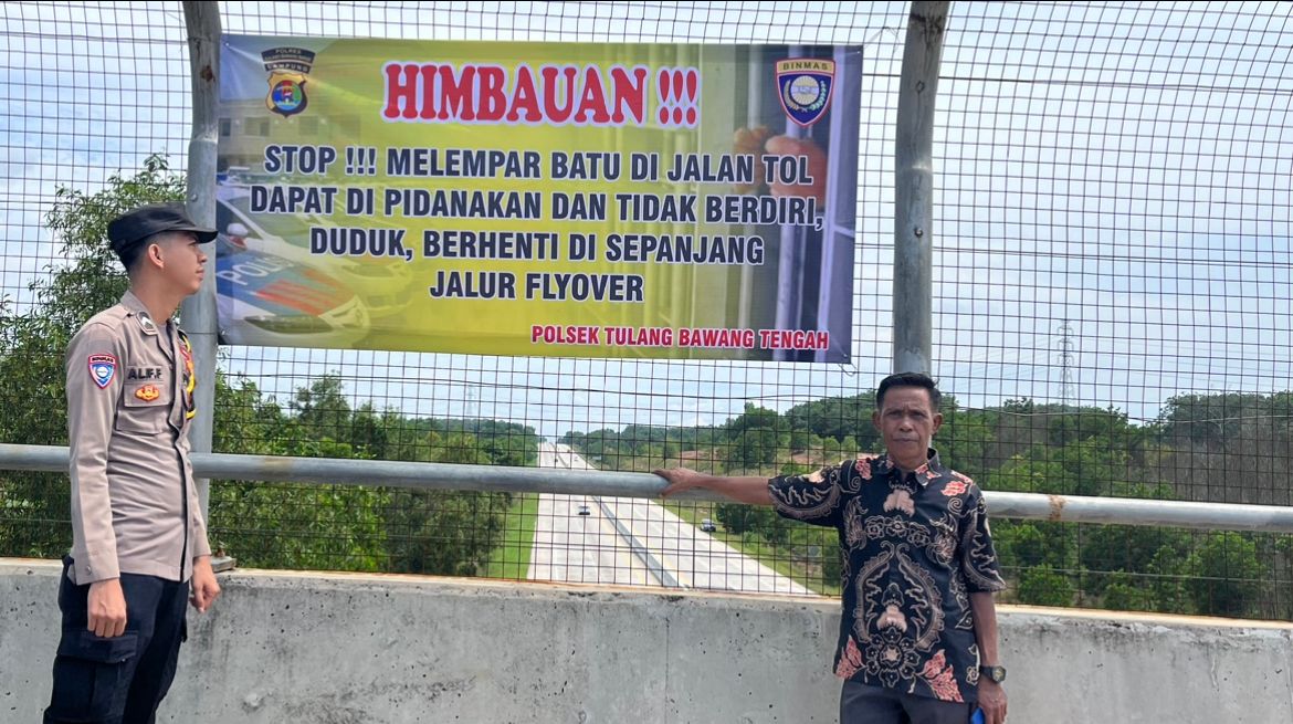 GerbangAndalas.com, Tulang Bawang Barat- Guna mencegah aksi pelemparan batu ke jalan Tol, jajaran Polsek Tulang Bawang Tengah Polres Tubaba Polda Lampung, melaksanakan patroli sekaligus memasang dua spanduk himbauan di jembatan penyeberangan (Fly Over) km 178 Tiyuh Marga Jaya Indah Kec. Pagar Dewa dan Tiyuh wonokerto Kec.Tulang Bawang Tengah Kab.Tulang Bawang Barat. Sabtu (29/03/2025)