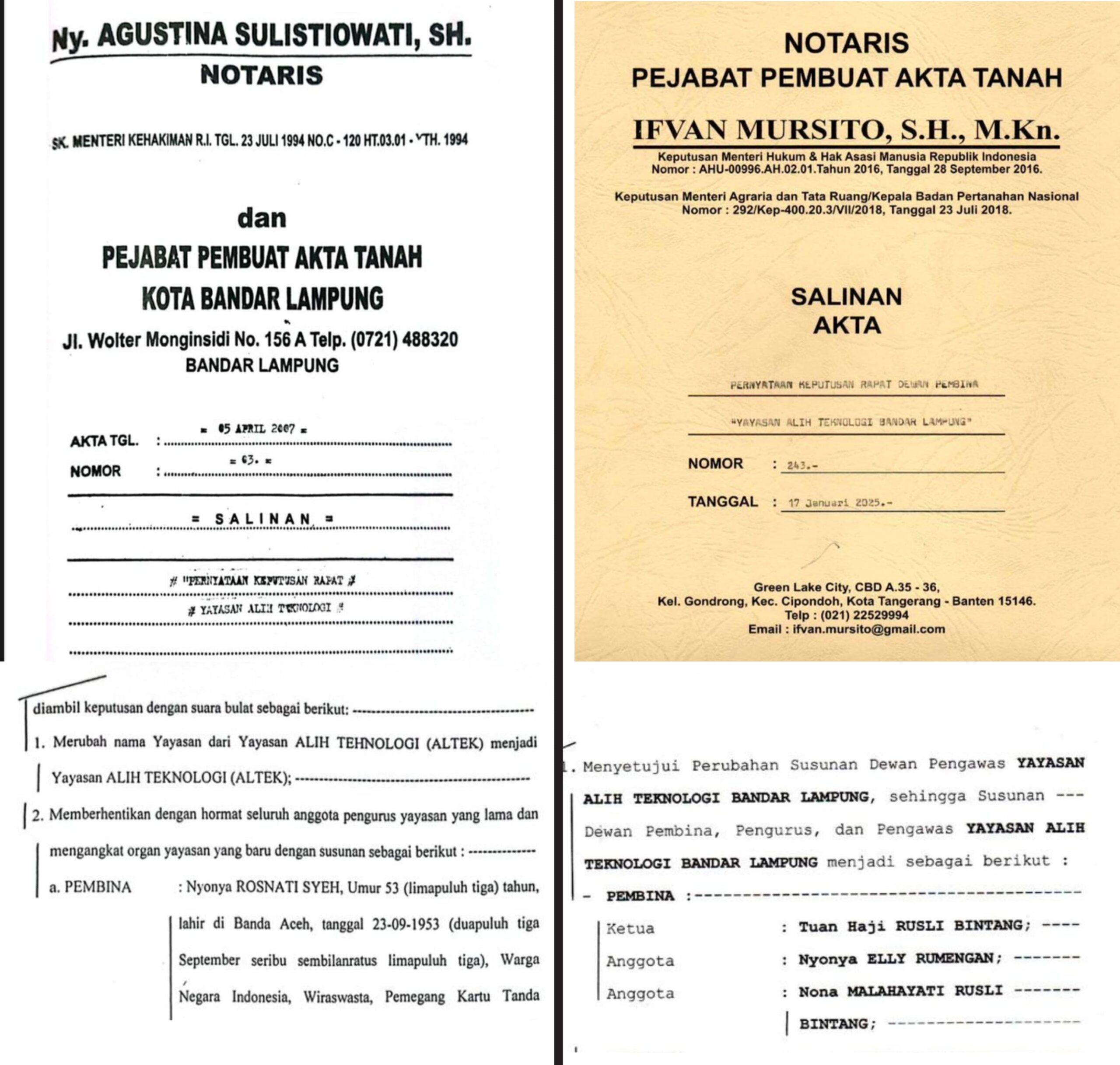 Berdasarkan Akta Notaris Nomor 3 Tahun 2007, Rosnati tercatat sebagai pembina tunggal yayasan. Namun secara diam-diam, namanya dihapus dan digantikan oleh istri muda Rusli Bintang, Ely Rumengan, serta anak-anak dari pernikahan keduanya. Perubahan ini dituangkan dalam Akta Notaris Nomor 243 yang diterbitkan oleh Notaris Ifvan Mursito, S.H., M.Kn., pada 11 Januari 2025.