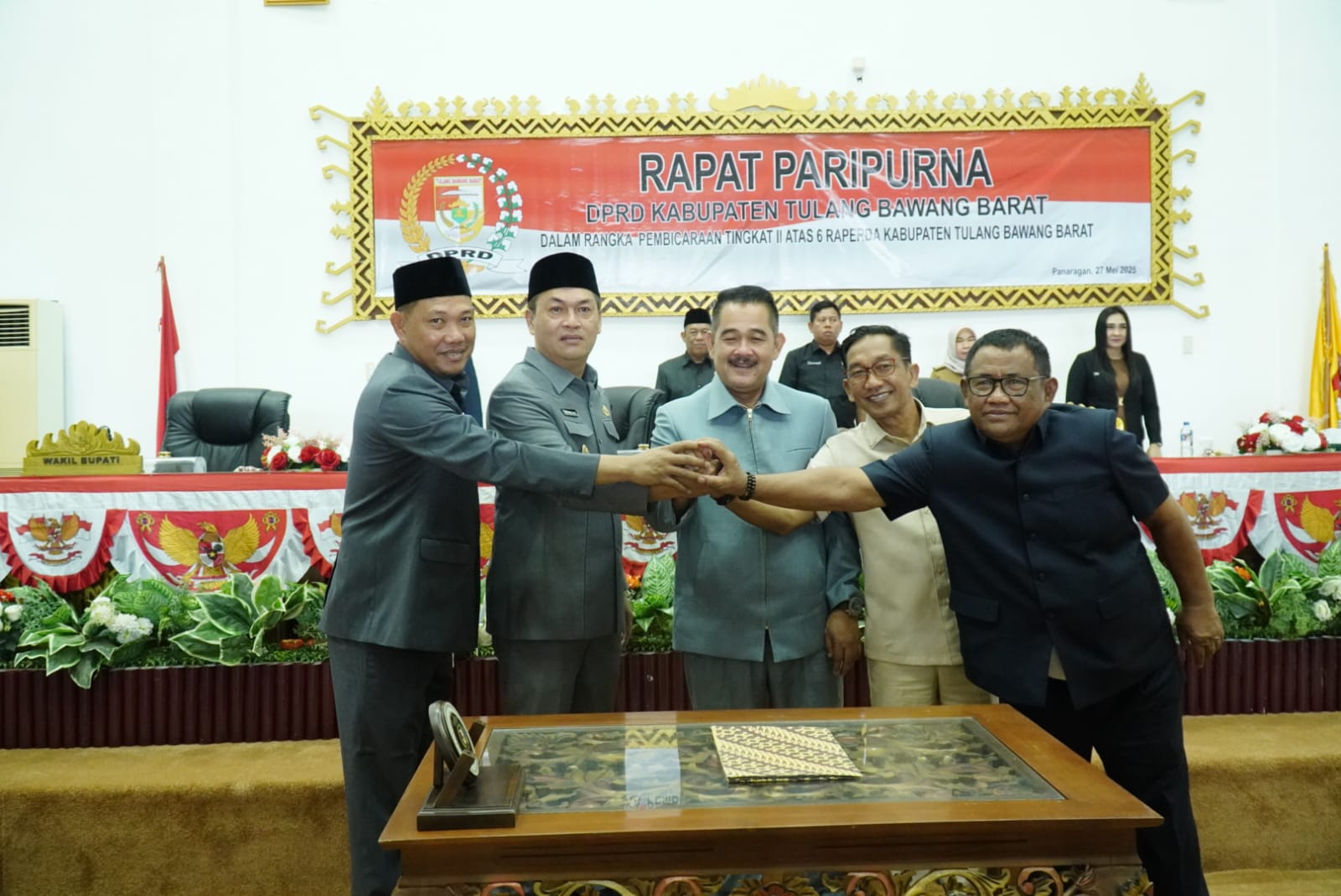 GerbangAndalas.com, Tulang Bawang Barat- Dewan Perwakilan Rakyat Daerah (DPRD) Kabupaten Tulang Bawang Barat Menggelar Rapat Paripurna Pembicaraan tingkat ll atas 6 (Enam) Rancangan Peraturan Daerah (Raperda) Kabupaten Tulang Bawang Barat, Yang berlangsung di Ruang Rapat Paripurna DPRD Kabupaten Tubaba setempat, Selasa (27/5/2025).