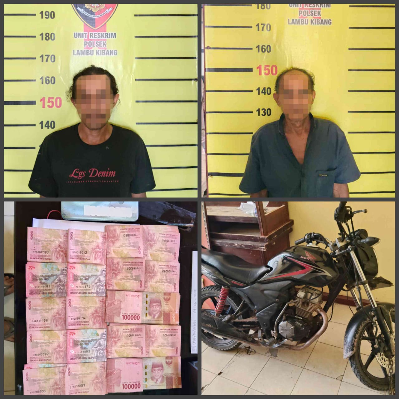 Uang Tunai sejumlah Rp. 10.000.000,- ( sepuluh juta rupiah) dengan rincian pecahan uang 100 rb sebanyak 100 lembar, 1 (satu) buah Hp merk Oppo A12 warna biru langit, 1 (satu) unit kendaraan sepeda motor Honda Verza 150 cc tanpa nopol. ujar Kapolsek