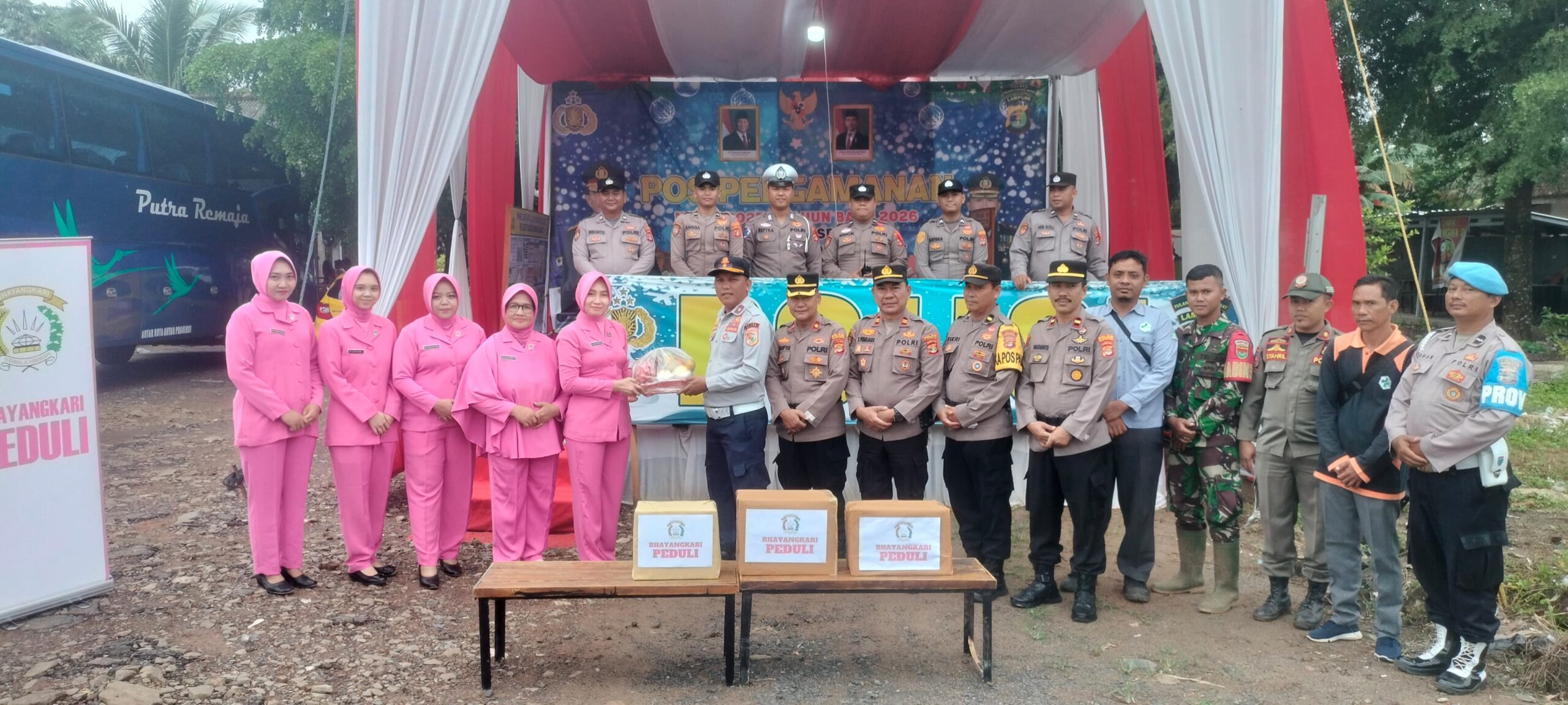 Kapolsek Tulang Bawang Tengah dan Kapolsek Tumijajar Bersama Ibu Ketua Bhayangkari Ranting Kunjungi Pospam Mulya Asri Berikan Bingkisan Kepada Personil Yang Bertugas